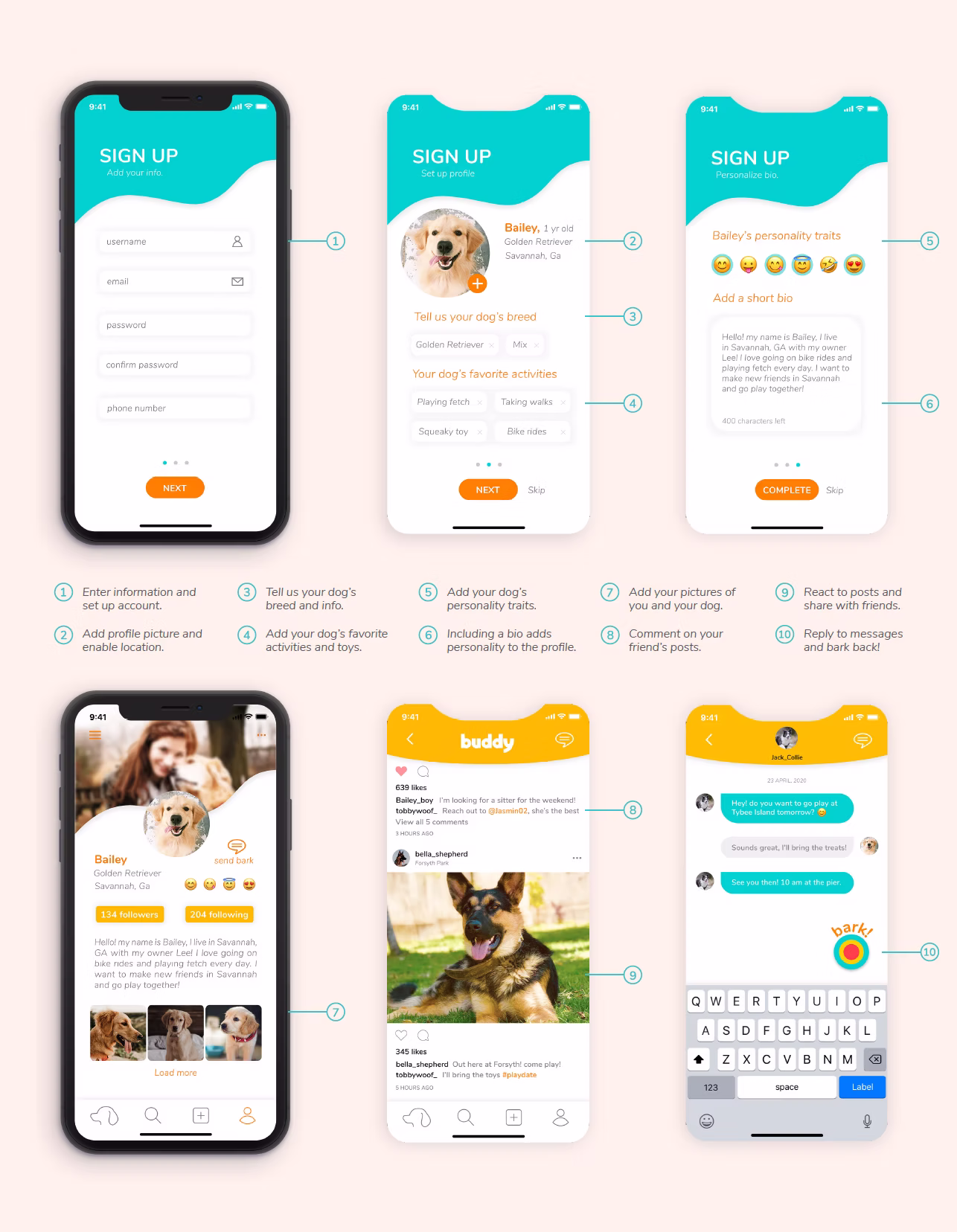 Buddy was imagined as a fun, community-focused app that makes it easy for pet owners to find caretakers, schedule drop-in visits, or connect their dogs with new playmates. The goal of the UX design was to keep everything simple and intuitive—users can navigate the app without thinking twice, while still enjoying a playful, friendly experience that matches the energy of the dogs themselves.